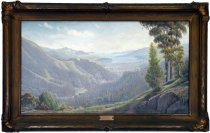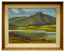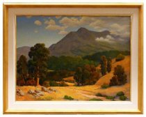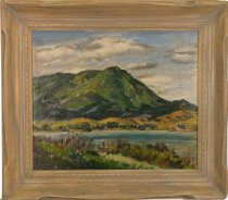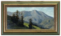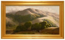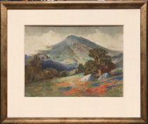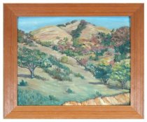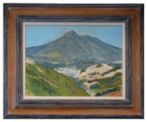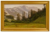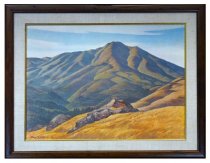 Oil painting depicting Mount Tamalpais from the south west - A framed oil painting on board showing a view of Mount Tamalpais from the southwest, with trees and a hillside in the foreground.