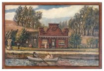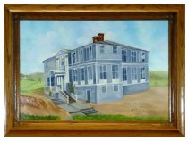Oil painting of 228 Almonte Boulevard - A framed oil painting depicting a house located at 228 Almonte Boulevard. Two figures are seated in a rowboat in the foreground.