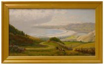 Stinson Beach and Bolinas Lagoon - Painting by Ludmilla Pilat Welch (1844-1919), depicting Stinson Beach and Bolinas lagoon, with cows grazing in the foreground. Signed, but not dated, circa 1900. Oil on canvas, 10 x 18 inches; framed: 12 1/4 x 20 1/2 inches.