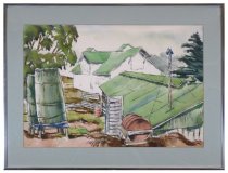 The back of a milk barn and out Painting depicting Diaz Ranch framed by trees - This framed painting by John Norall is unfinished, showing the back of a milk barn and out building of the Diaz Ranch, framed by trees.