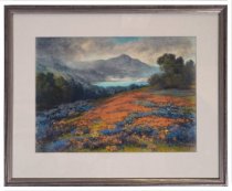 Oil painting depicting Mount Tamalpais in the background - This framed oil painting depicts Mount Tamalpais with a lake or reservoir in the middle background. Foreground is a hillside covered in orange flowers.