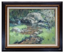 Rock Creek Springs, Mount Tamalpais - This framed painting depicts a creek or streambed with a large rock and grassy banks.