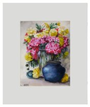 Matted watercolor painting depicting a still life of flowers and two vases - This matted watercolor depicts a still life of flowers and two vases.
