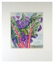 Framed watercolor painting. Depicts purple flowers of red and green foliage - This framed watercolor depicts purple flowers and red and green foliage.