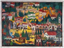 Our Mill Valley - Painting by Samuel Newsom (1898-1996), oil on board, dated 1945, depicting downtown Mill Valley, with Greyhound bus station, the town's original Carnegie Library, Old Mill, and other landmarks.